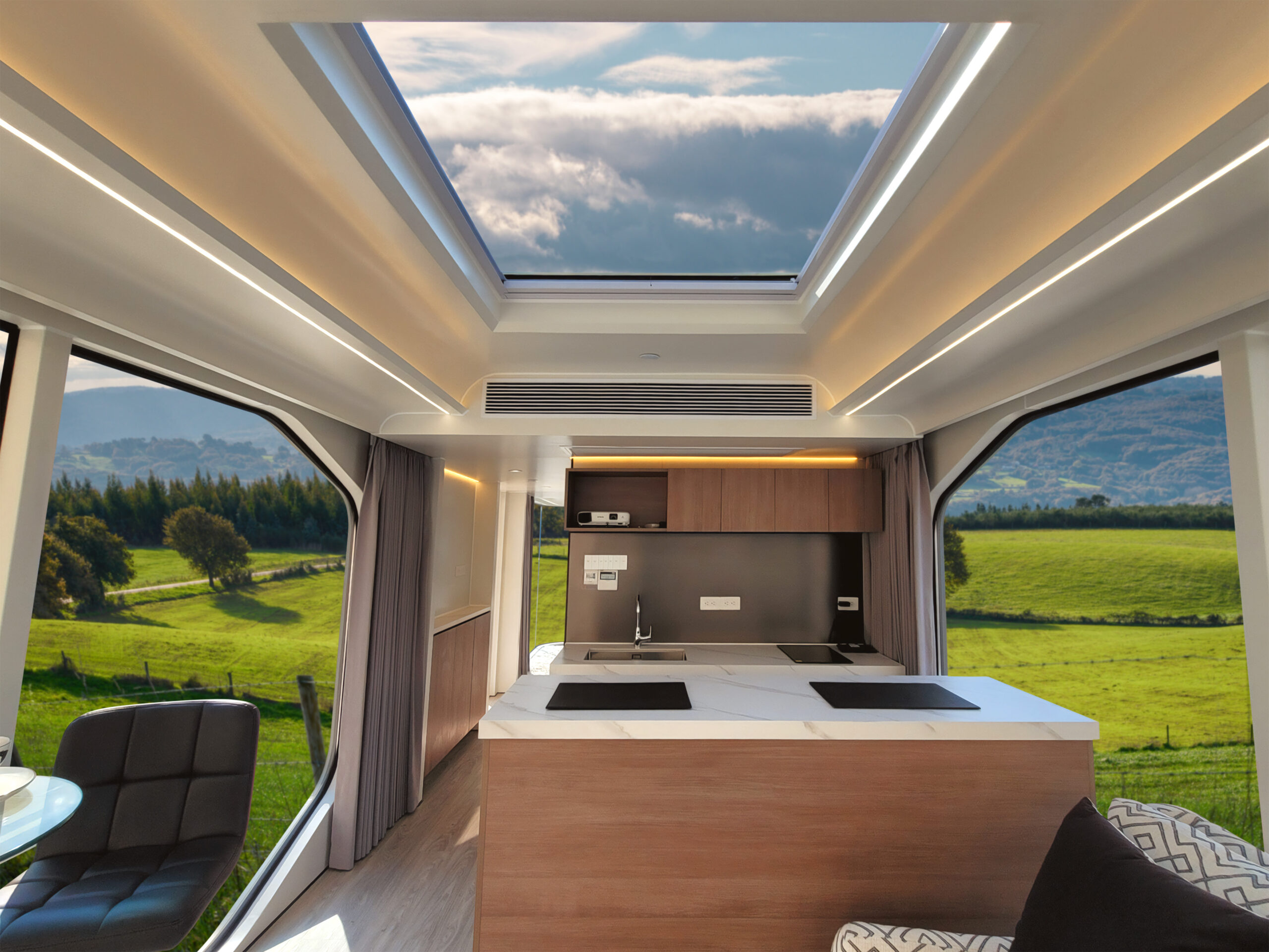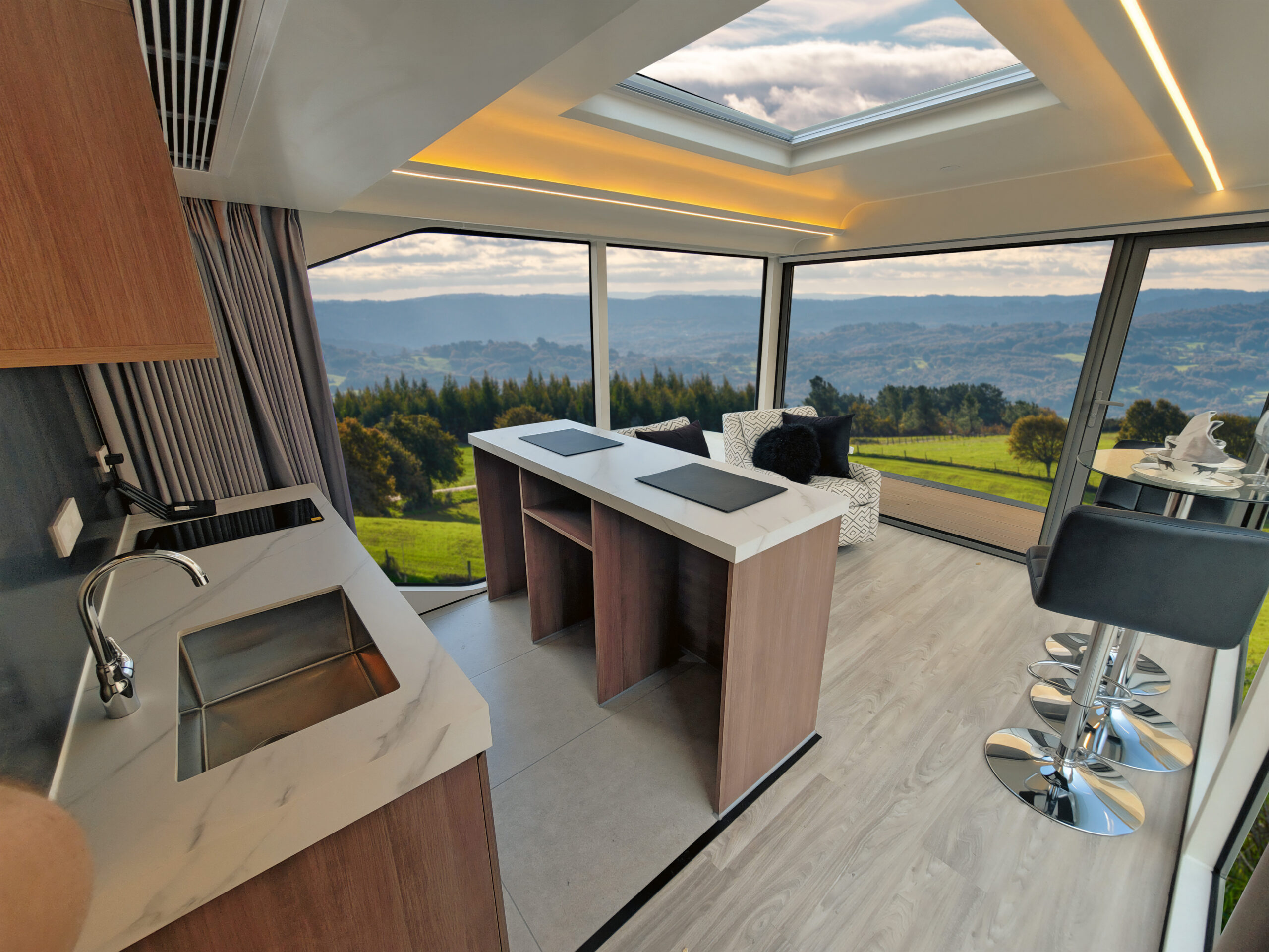 Escape to stunning 270° panoramic views through floor-to-ceiling windows, top-notch insulation, sleep under the stars or wake up to stunning sunrises, and recharge in pure natural surroundings.